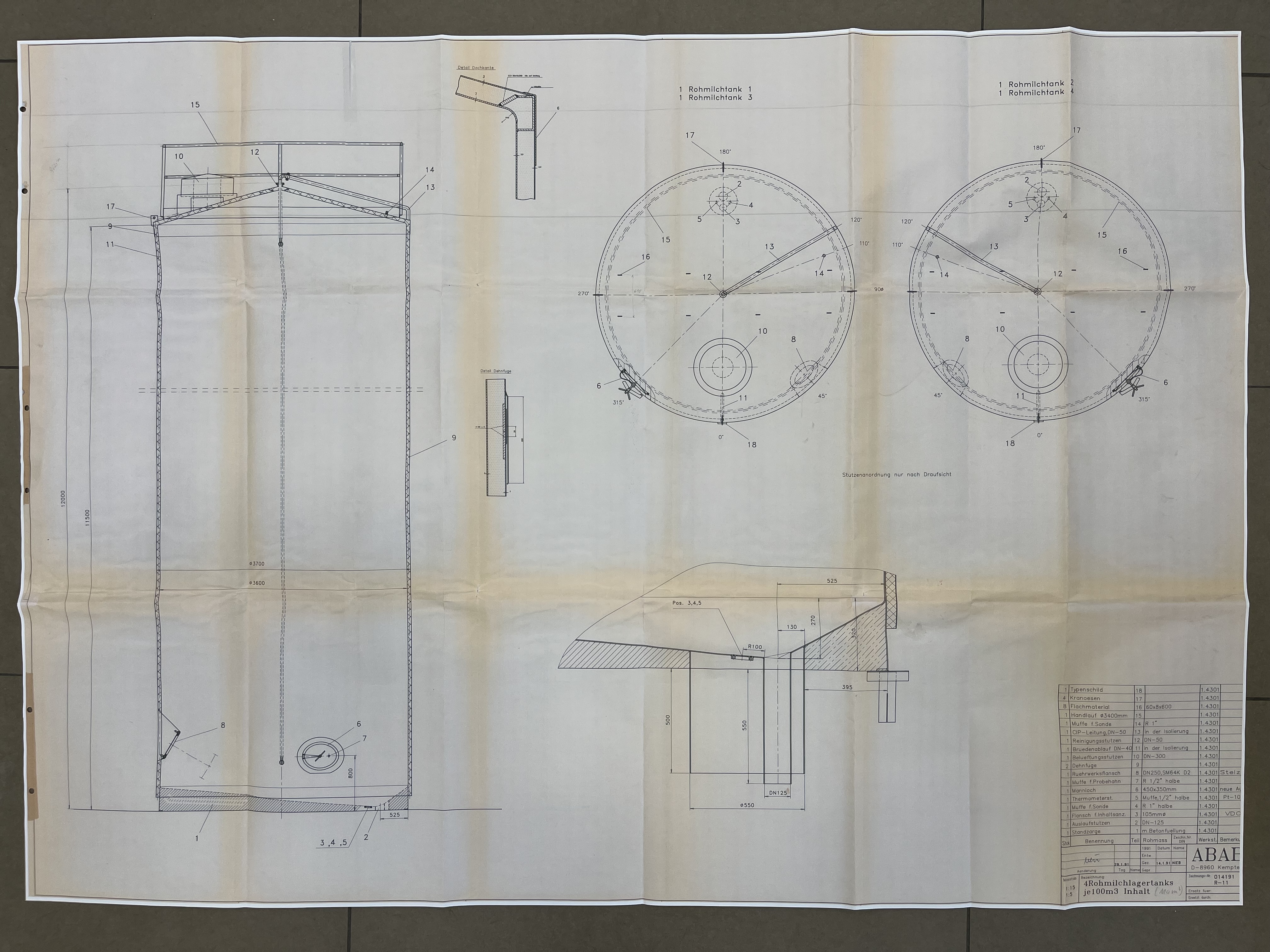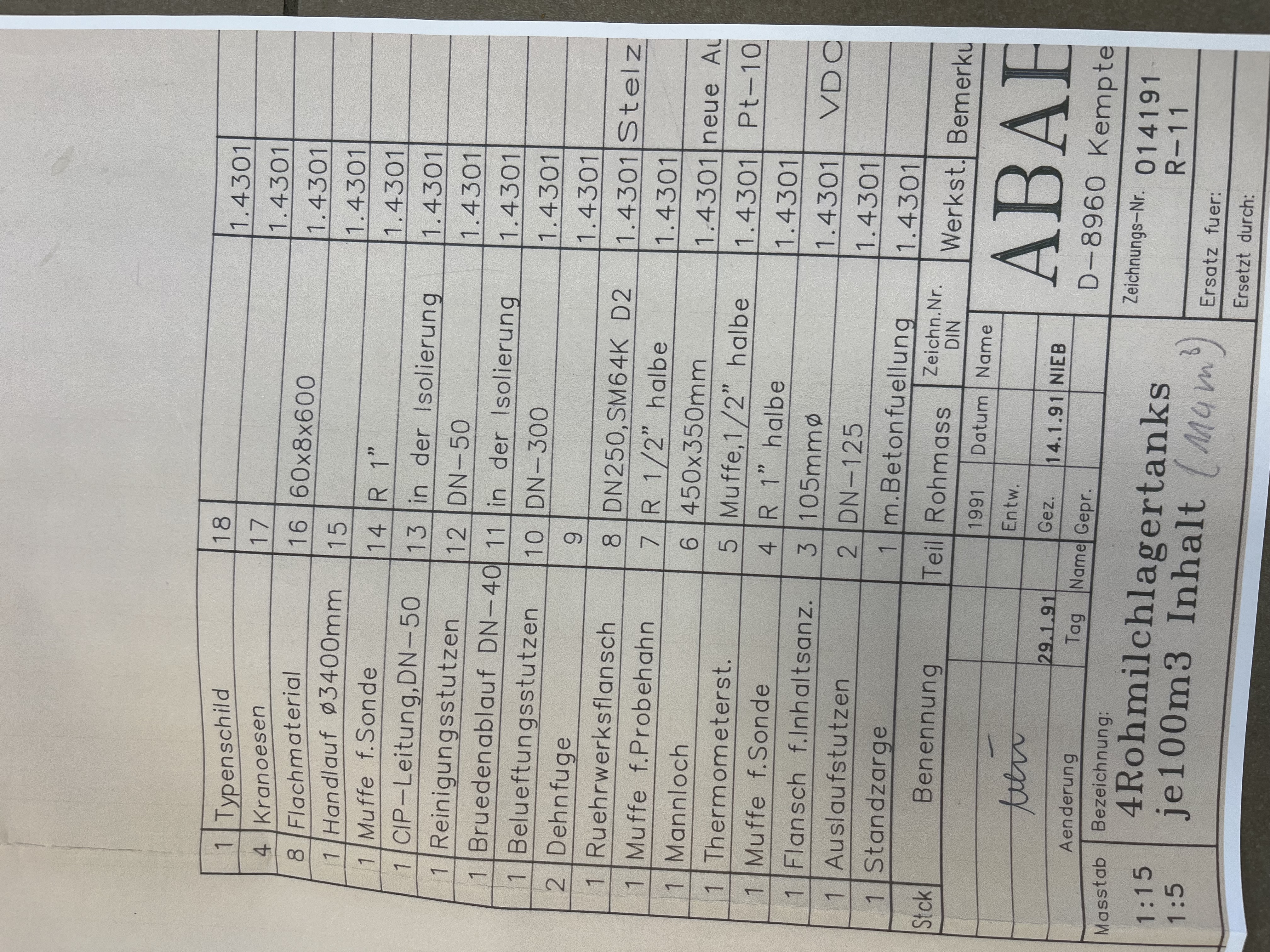 Container 100.000 liters made of V2A isolated, used consists of the material 1.4301(AISI304) V2A. The volume is approx. 100,000.00 litres. The diameter inside includes 3,600 mm. Container 100.000 liters made of V2A isolated, used was last used in the following area: Foodstuffs. Delivery can take place worldwide.