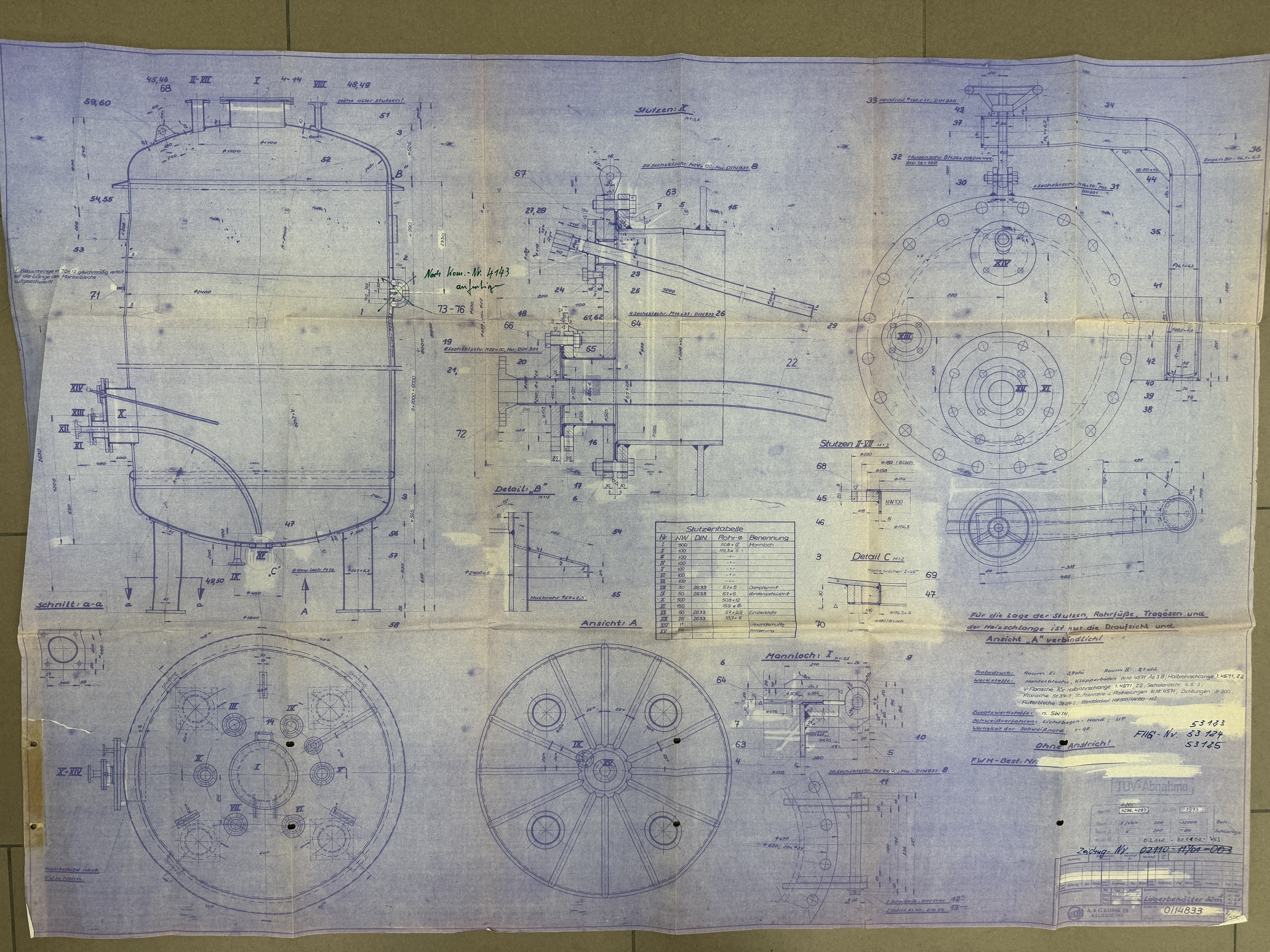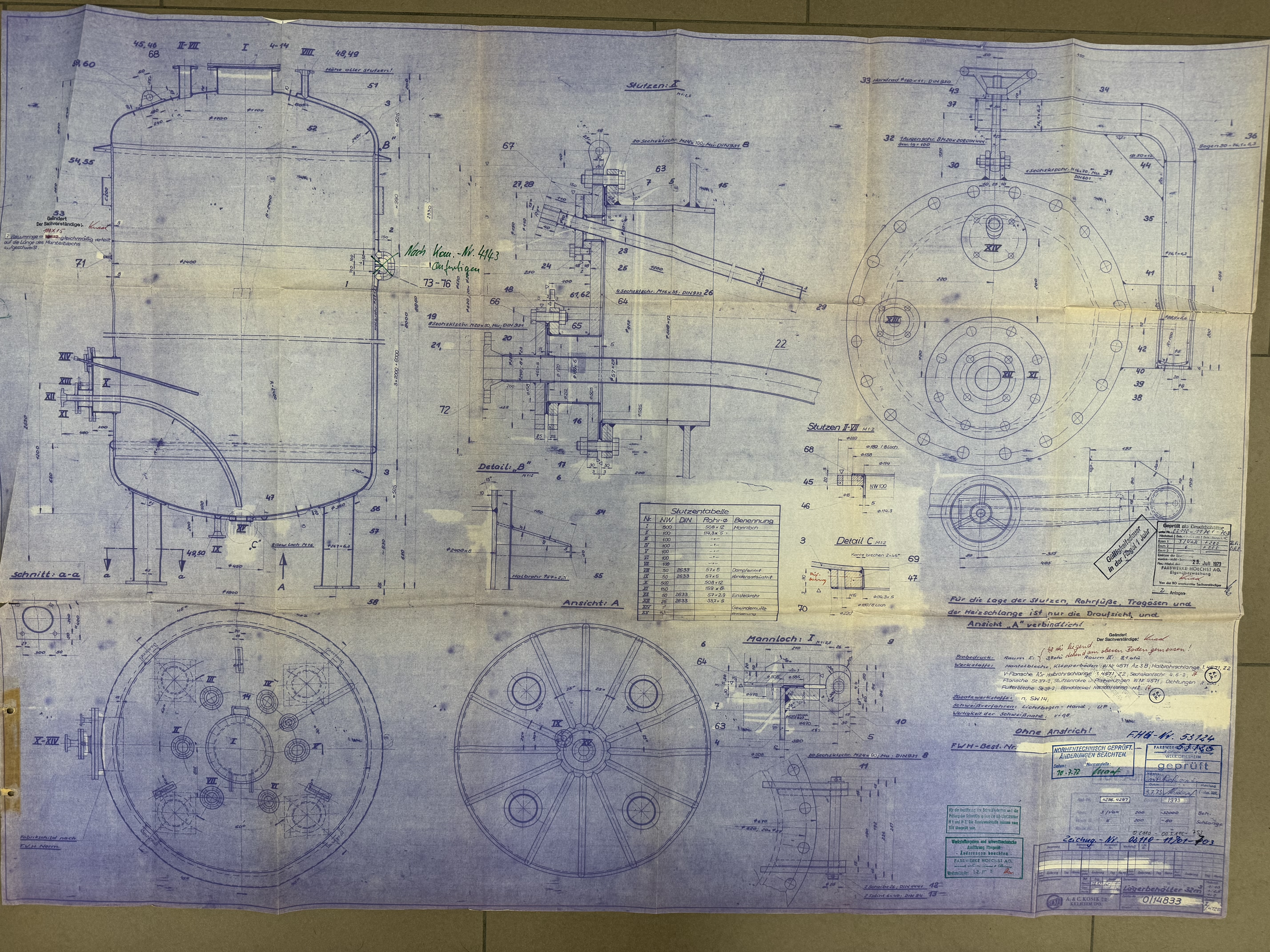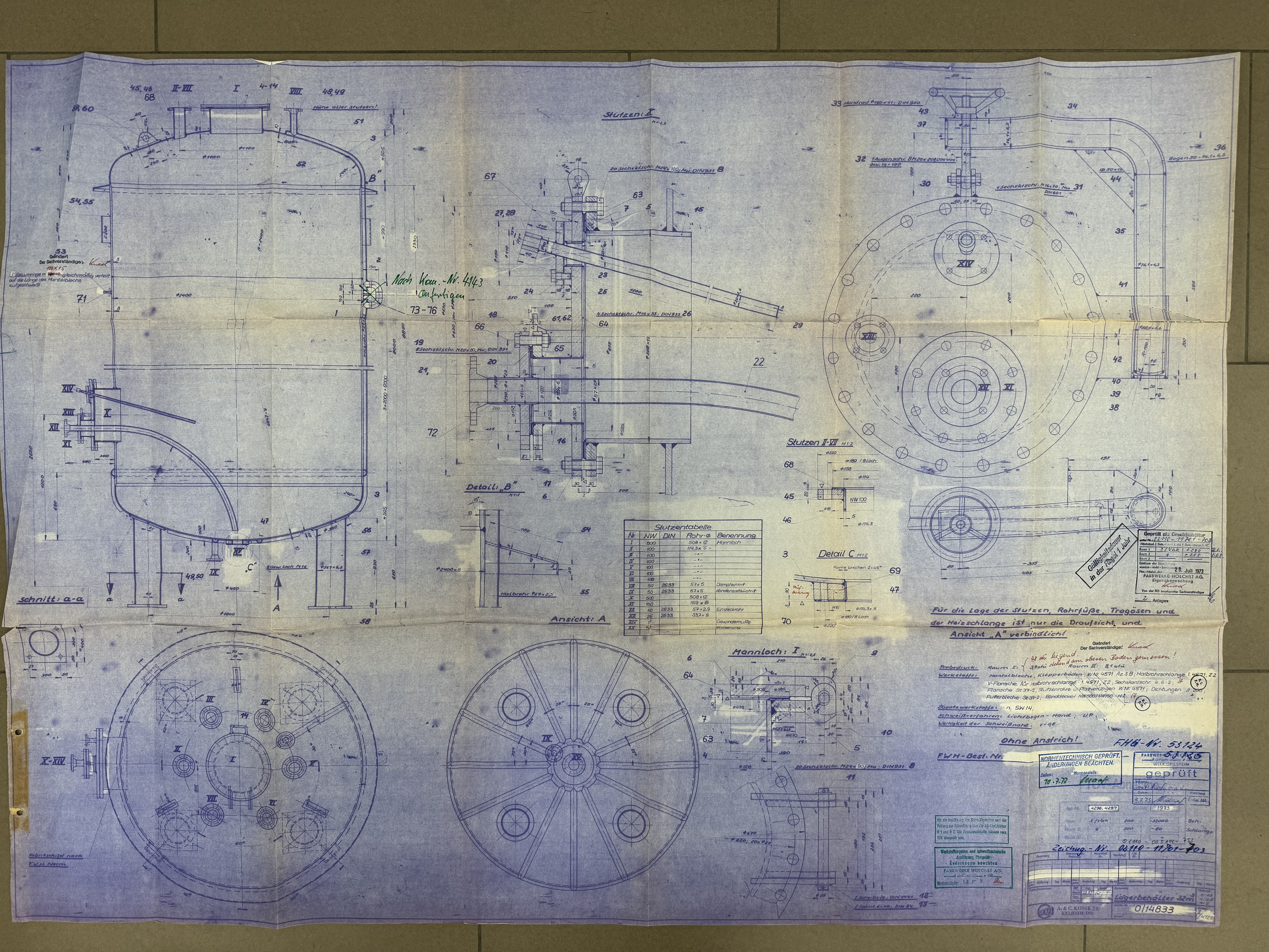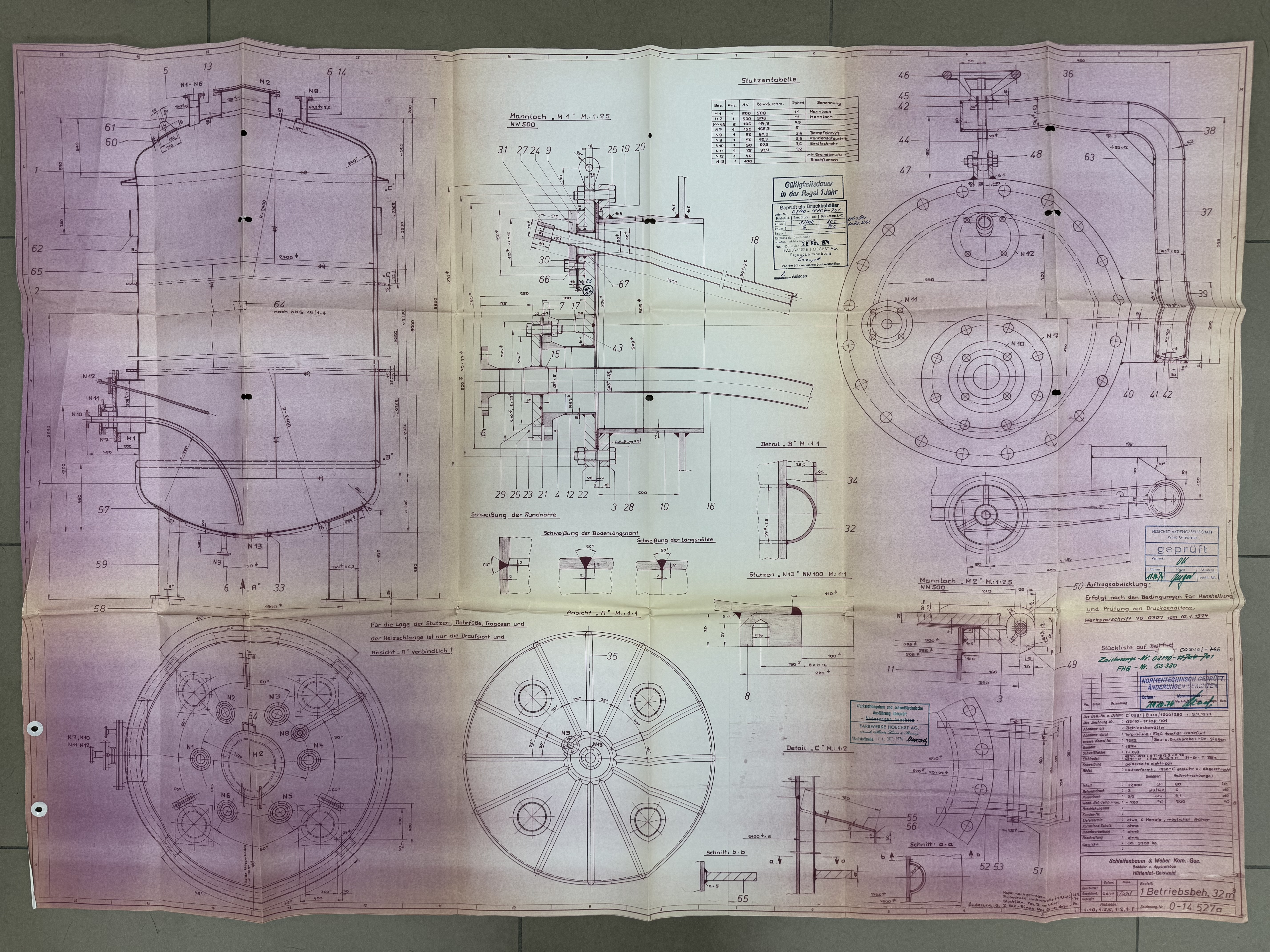 Pressure tank 32.000 liters made of V4A, temperature-controllable, used consists of the material 1.4571(AISI316) V4A. The volume is approx. 32,000.00 litres. The diameter inside includes 2,400 mm. Pressure tank 32.000 liters made of V4A, temperature-controllable, used was last used in the following area: Chemistry. Delivery can take place worldwide.