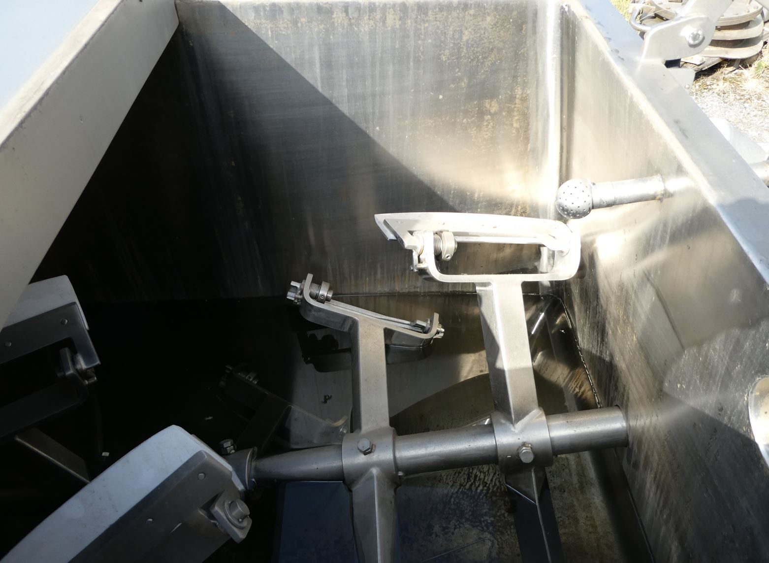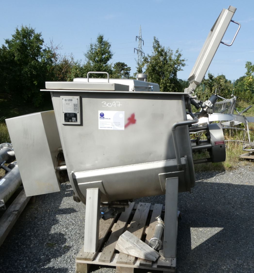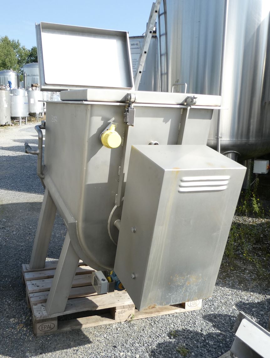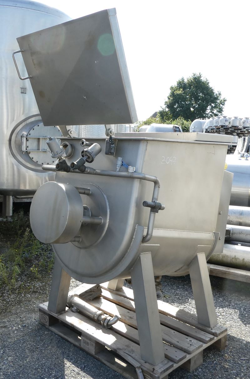 Mixing container 700 liters, temperature-controllable, used consists of the material 1.4301(AISI304) V2A. The volume is approx. 700.00 litres. Mixing container 700 liters, temperature-controllable, used has the following dimensions: length 1,900 mm, width 900 mm, Mixing container 700 liters, temperature-controllable, used was last used in the following area: Foodstuffs. Delivery can take place worldwide.